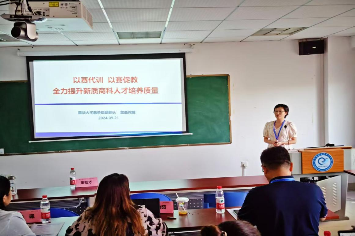 詹晶教授以《以赛代训,以赛促教-全力提升新质商科人才培养质量》为题展开演讲。她从参赛动员工作,参赛准备工作,困难与思考三个方面展开,提出了学校高度重视,鼓励教师培训,搭建师生交流平台,督促学生参加线上培训,学习其他大赛经验等多种提升新质商科人才培养质量的方法。最后,她从当下大赛举办的困难提出了几点建议,为解决当下大赛的困难提出了一些解决方案。