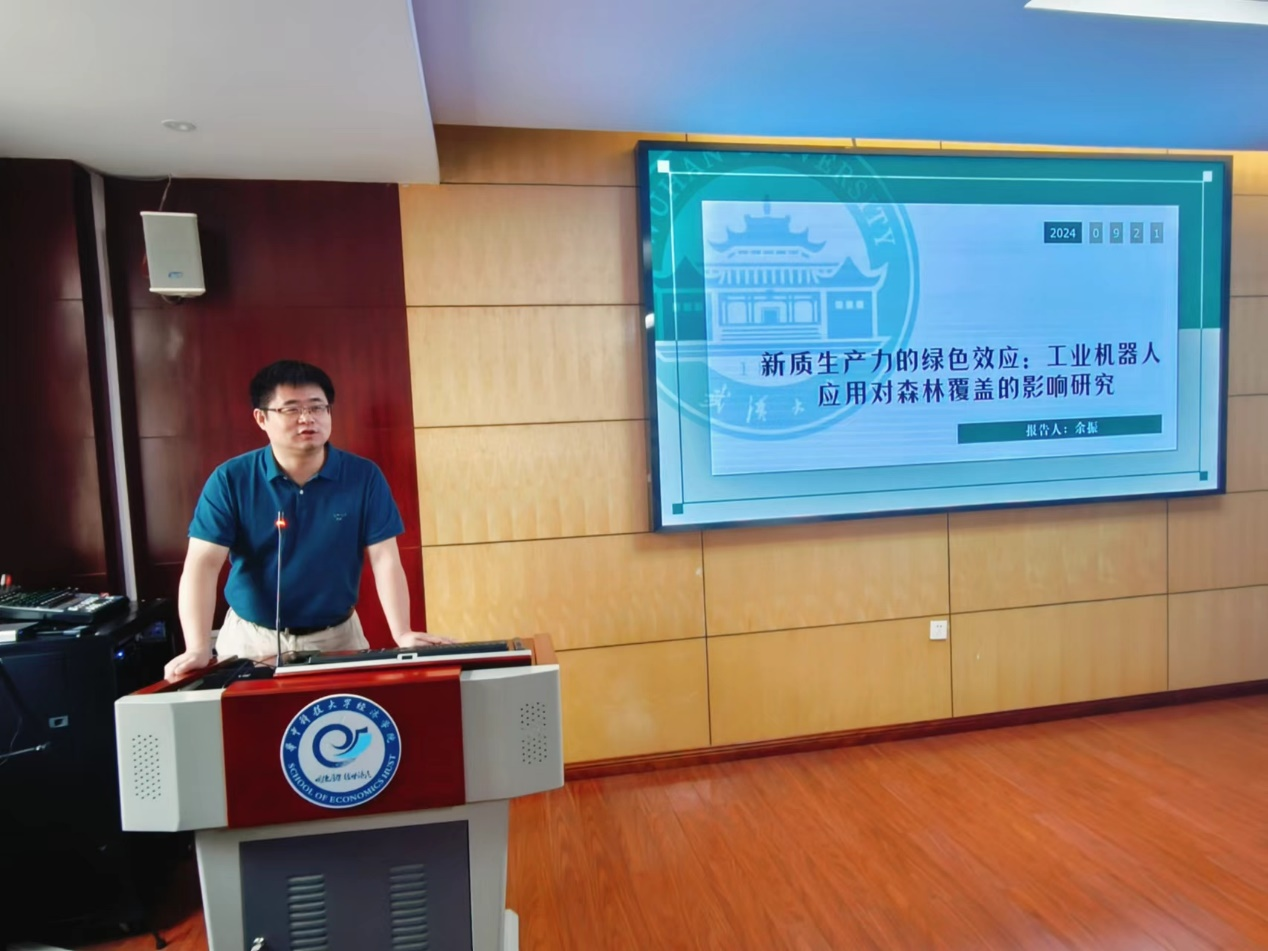 余振教授以《新质生产力的绿色效应》为主题进行报告。他提出蕴含新质生产力内涵的工业机器人,能否提高我国森林覆盖,实现“青山常在”这一问题并构建了一个包含机器人、劳动力和土地投入的微观理论模型,实证检验机器人使用对森林覆盖率的影响、作用机制和异质性。他的研究显示,工业机器人应用有利于提高当地森林覆盖。每万人的机器人使用量每增加一个单位,地区森林覆盖率增加0.0141个百分点。