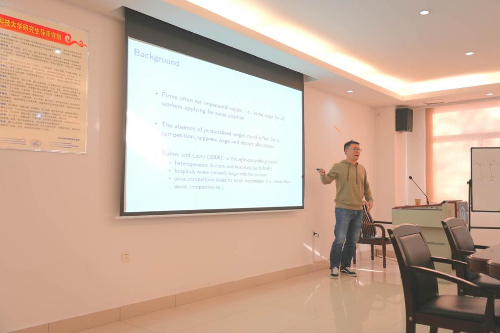 皇甫秉超围绕《Matching and Price Competition in Large Markets》进行分享。文章聚焦于非个人工资竞争在大型市场中所产生的影响展开深入探究。在设定存在有限多种类别的企业与工人的情境下,企业通过制定工资策略来吸引工人,他的研究证实,在此种市场环境下的竞争呈现出局部性特征:企业主要与类型相近的企业存在竞争关系,具体而言,要么是与同类别企业竞争,要么是与高一级别的企业竞争,而这一竞争模式与相应的VCG 结果中所涉及的约束性激励约束条件相互契合。此外,文章还精准刻画了该均衡状态向企业最优竞争均衡趋近的速率。
