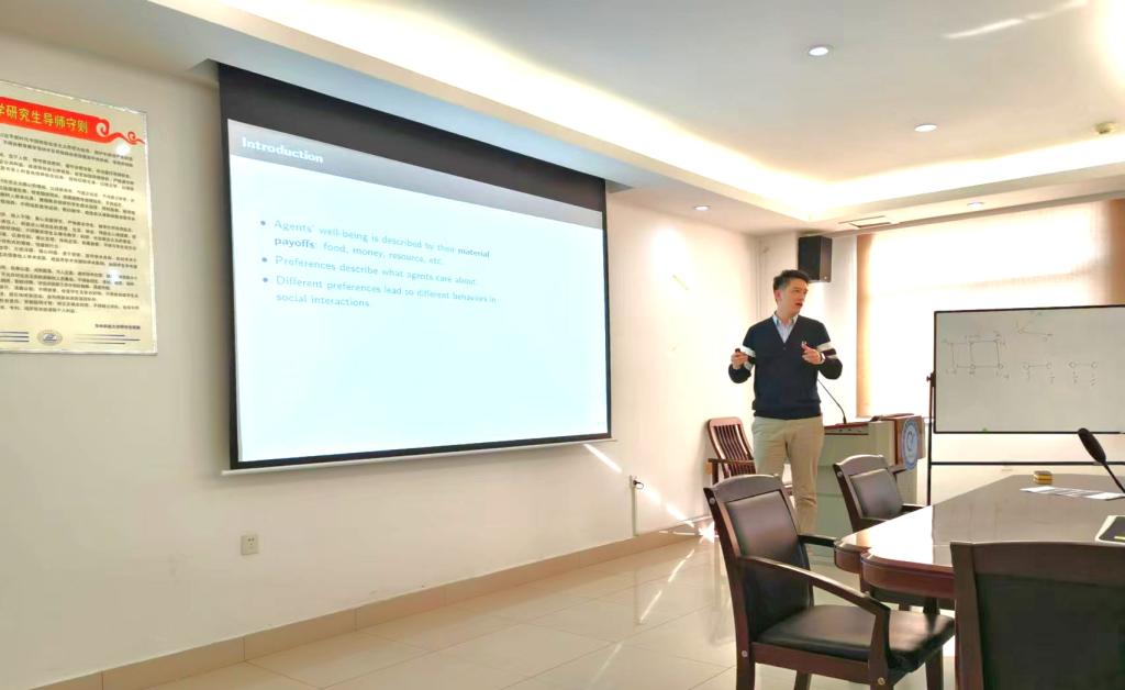 王子伟作《Preference Evolution under Partner Choice》主题报告,他提出了一个研究具有内生匹配的偏好演化的模型。他的分析揭示,内生匹配产生了一类既表现出同质性又具有效率的偏好。这种偏好在演化过程中脱颖而出,因为它们能够促成正向的匹配和有效的行为。在不完全信息的情况下,一种强烈的同质性形式——狭隘主义,对于一种偏好能否在演化中占优是必要的,因为在存在信息摩擦的情况下,需要更强的激励来进行自我分类。