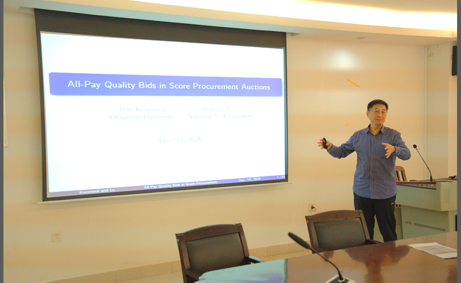 吕景峰以《All Pay Quality-Bids in Score Procurement Auctions》为题进行主题报告。通过展示关于分数采购拍卖中全支付质量出价的研究成果,他的研究发现质量出价、供应商与采购商收益不受价格出价是否依质量出价而定的影响。对比赢者支付质量出价基准,全支付质量出价虽降低质量提供与供应商收益,但常使总剩余和采购商收益增加。