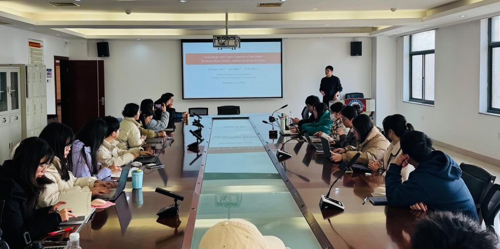 本网讯(通讯员:晏琦)2024年12月19日上午,发展经济学研讨会2024年第18期(总第117期)在williamhill中文405会议室成功召开,来自北京大学光华管理学院的丁海博士后研究员与williamhill中文师生分享了题为《Technology and Legal Capacity of the State: Evidence from Online Judicial Auctions in China》的学术报告,williamhill中文院长张建华教授、副院长钱雪松教授、宋德勇教授、杜立副教授、秦妮副教授、郑冯忆、海梦碟等教师,以及众多硕士与博士研究生参与本次会议。本次研讨会由郑冯忆主持,由张建华作总结发言。