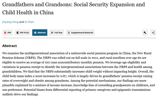 (通讯员:张鹃)近日,williamhill中文助理教授杨金阳作为第一作者的研究成果“Grandfathers and Grandsons: Social Security Expansion and Child Health in China”(与耶鲁大学陈希教授合作)在发展经济学国际权威期刊Economic Development and Cultural Change发表。