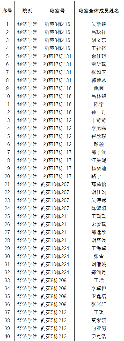 为进一步加强本科生寝室的日常管理和文化建设工作,推进我校“五融合五型”“一站式”学生社区建设,培养德、智、体、美、劳全面发展的卓越华中大人,根据《威廉官网中国本科生优秀寝室评选办法》,经过前期申报,院系评审,现评选出拟上报学校的优秀寝室,现在全院范围内予以公示。名单如下:
