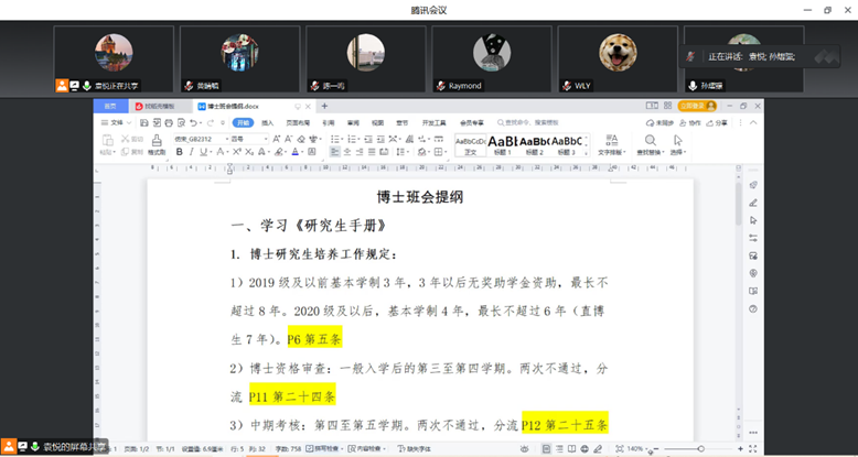 班会首先学习了各年级对于基本学制及最长学制的不同要求,随后讲解学校博士研究生培养对于博士资格审查以及中期考核的详细规定,提醒同学们要珍惜时间,根据自身实际情况,合理规划学习研究。