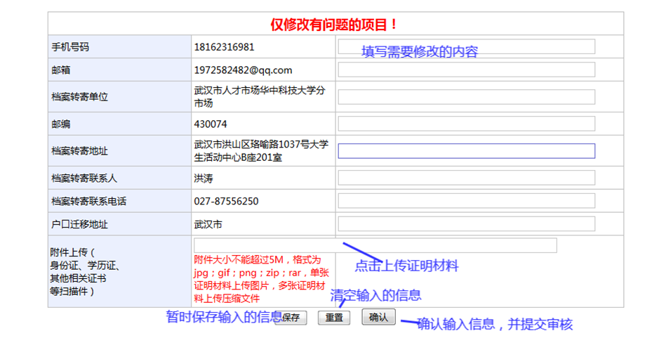 ①如果各项信息不需要修改,或只有手机号码和邮箱需要修改,请直接修改后,只点击“保存”。