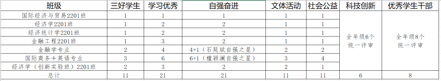 三好学生奖学金、学习优秀奖学金、自强奋进奖学金、文体活动优秀奖学金、社会公益奖学金按照专业班级人数和学业综合表现分配如下: