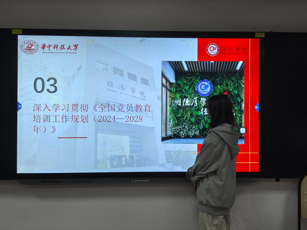 williamhill中文2024级硕士生金融党支部崔晨洁同志分享党会内容,分别从“深入学习全国两会精神”、“学习领会习近平总书记重要指示精神”和“深入学习贯彻《全国党员教育培训工作规划(2024—2028年)》”三方面进行讲解。