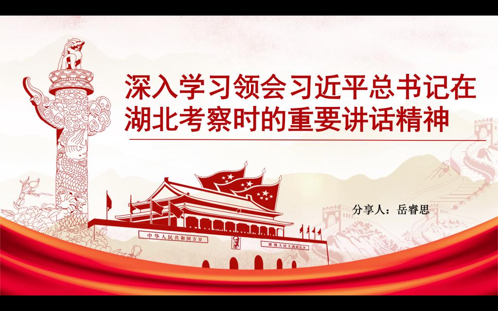 会议第一项,理论学习。首先,岳睿思同志带领支部成员学习领会习近平总书记在湖北考察时的重要讲话精神,强调湖北要深入贯彻党的二十大和二十届三中全会精神,坚持稳中求进工作总基调,牢牢把握在构建新发展格局中的使命任务,充分发挥自身优势,鼓足干劲、奋发进取,久久为功、善作善成,在长江经济带高质量发展中奋勇争先,加快建成中部地区崛起的重要战略支点,奋力谱写中国式现代化湖北篇章。