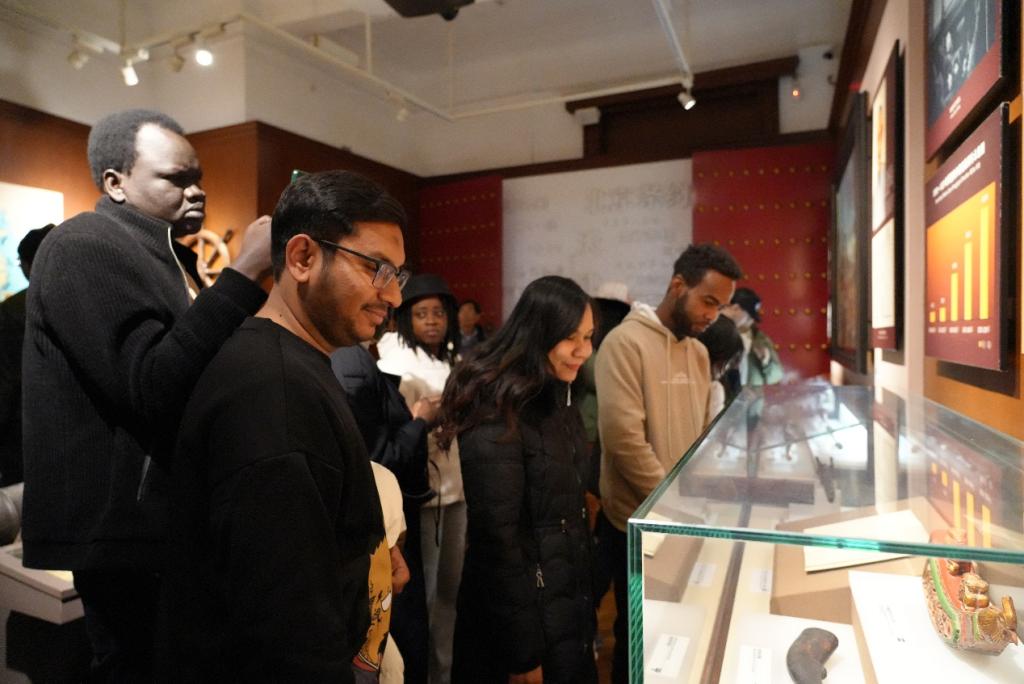 随着江汉关博物馆讲解员李小川老师和2022级本科生王浩轩、刘雨欢志愿同学等双语讲解员的脚步,全体师生欣赏了众多珍贵的文物,其中包括了青铜器、陶瓷、书画和古籍等。这些文物承载着古代文明的智慧与精华,展现了武汉这座城市悠久的历史和丰富的文化。观赏这些文物,我们仿佛穿越时光隧道,感受到历史的韵味与特殊的文化魅力。