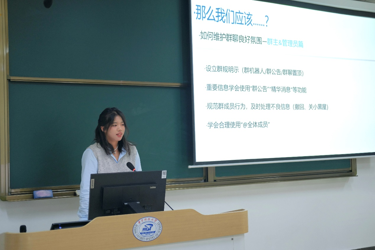 10月11日,数字经济2402班《共筑清朗网络空间,争做文明上网使者》网络主题班会在东九楼D106教室召开。此次班会经过班长吴雨秦的讲解,同学们积极参与文明网络建设的意识得到深化,网络聊天交往的习惯得到进一步提升。
