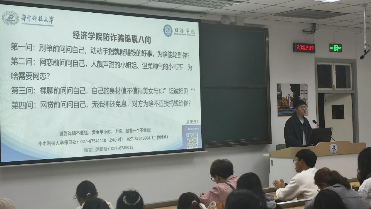 然后,曾雨龙结合近期本校诈骗案例,向学生讲述如何避免受骗,并向学生提出反诈八问,增强学生的反诈意识。