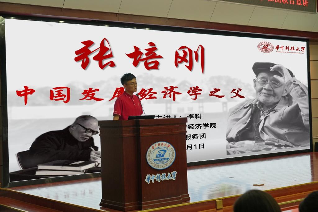 服务团讲师李科宣讲《张培刚——中国发展经济学之父》课程,详细介绍了张培刚先生从青年时期开始的学习、科研和实践报国的传奇人生。展现了一代大师为国求索的学术创新精神和忠心报国的赤子情怀,号召全体学生以张培刚老先生为榜样,担起历史赋予的责任与使命,敢于挑战学术困难,以赤诚之心报效祖国。