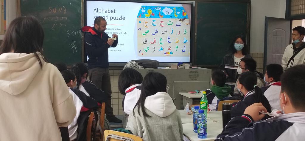 随后,国际留学生们分享了他们童年的玩具。来自阿拉伯国家的志愿者杨航和于思娜介绍了他家乡的特色玩具和有趣文化现象。将玩具巧妙的和文化特色结合在一起,引发了同学的强烈兴趣。杨航介绍了阿拉伯数字的来历以及现在和过去阿拉伯数字的不同,还分享了自己带来的印有数字的卡片,大家连连感叹。于思娜流利的中文也大受同学们的欢迎。志愿者徐圆兰为学生们进行翻译,帮助同学们更好地理解留学生志愿者展示的内容,现场气氛轻松愉快。