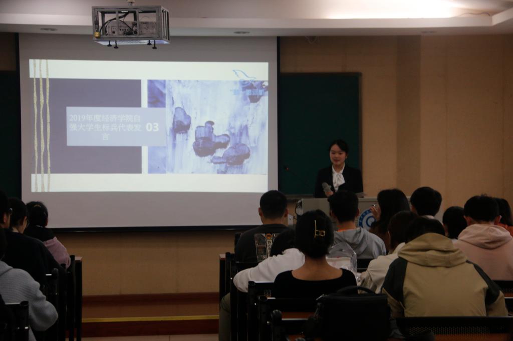 2019年度自强标兵代表孙颖慧上台发言,她认为找到自己的爱好与发展方向是自强之基础,自强其实并不必来得轰轰烈烈,找到自己喜欢的生活方式并坚持下去便不失为一种积极向上的自强态度。此外,也应不断尝试新事物,向未知发起挑战,唯此,才算是不辜负美好的青春年华。