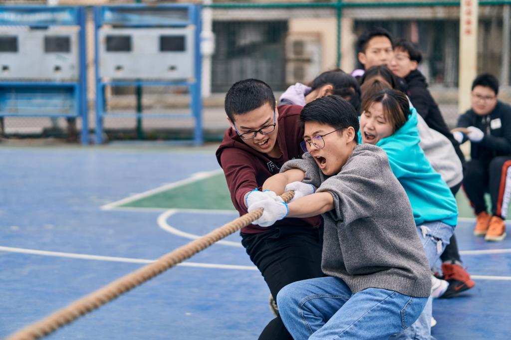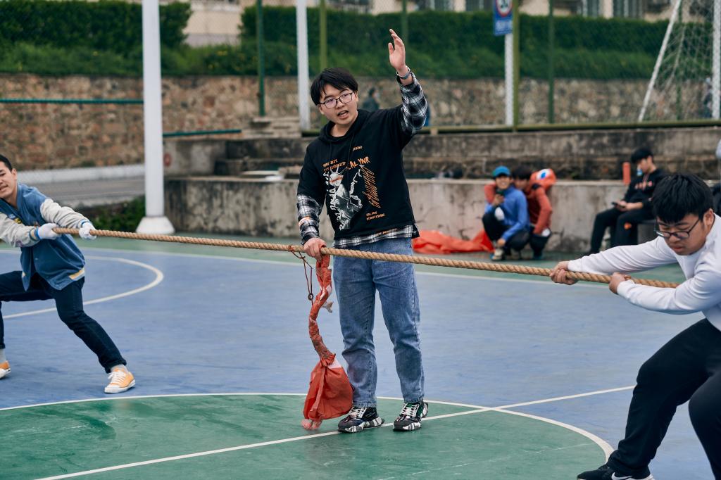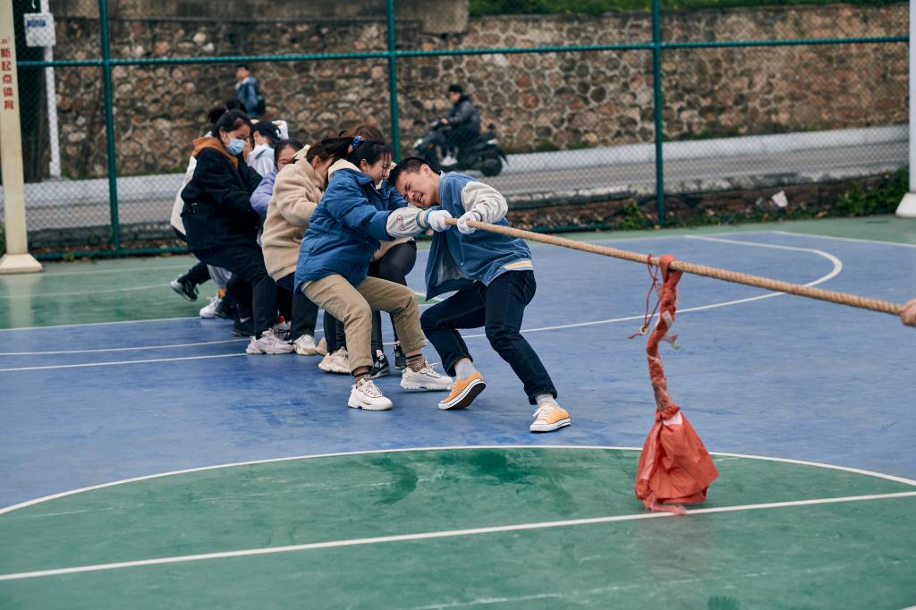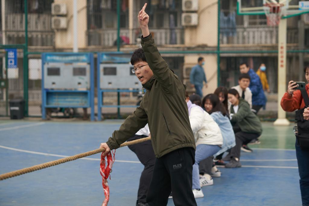 当比赛的哨声响起,只见参赛的队员们紧握长绳,铆足劲向后拉绳;场下成员也情绪激昂地为参赛选手呐喊加油,富有节奏的呐喊声、加油声,充斥在球场上空,久久回荡。无论是场上还是场下,气氛都异常活跃,尤其是在胜负难分的时刻,大家毫不退却,咬紧牙关,坚持到底。赛场上的队员个个斗志昂扬,用他们的汗水讲述了团结的含义,他们顽强的毅力与拼搏的精神让在场的每一个人热血沸腾。