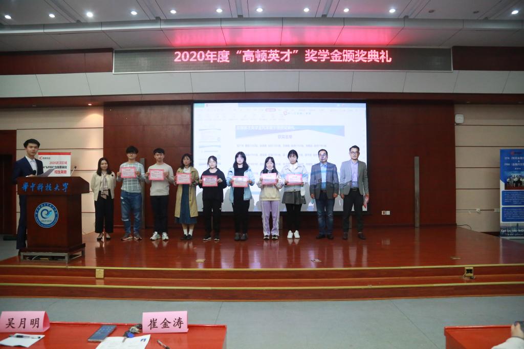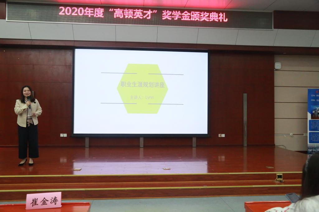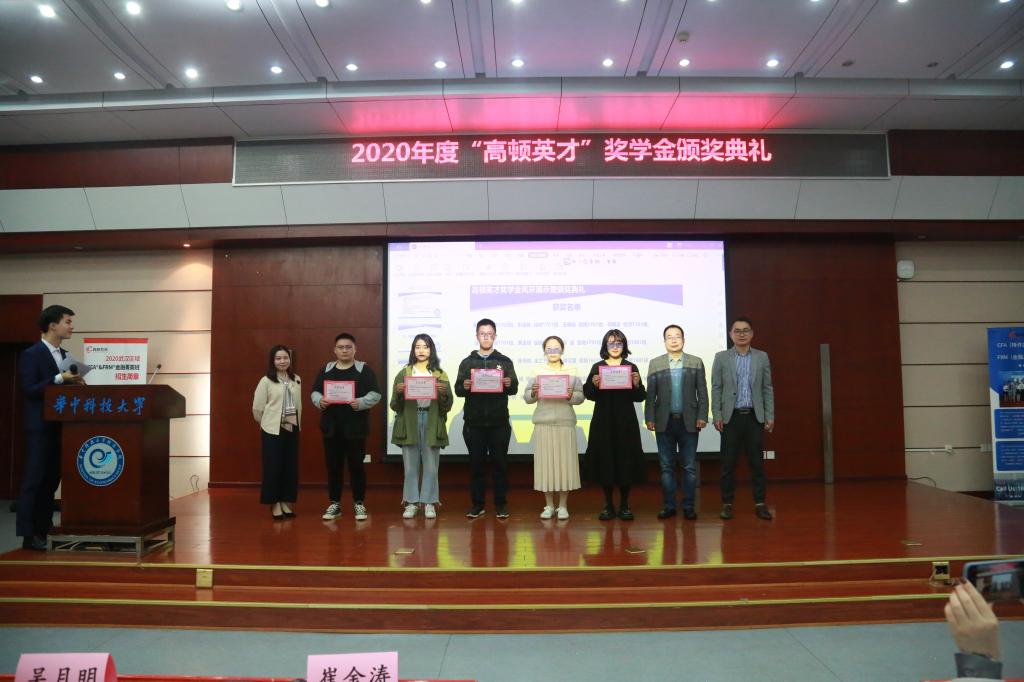 主持人对高顿英才奖学金的设立目的及获得条件进行了简要介绍,宣读了17级、18级、19级三组奖学金获得者名单,并请获奖者上台领奖,三位出席嘉宾为奖学金获得者颁奖。