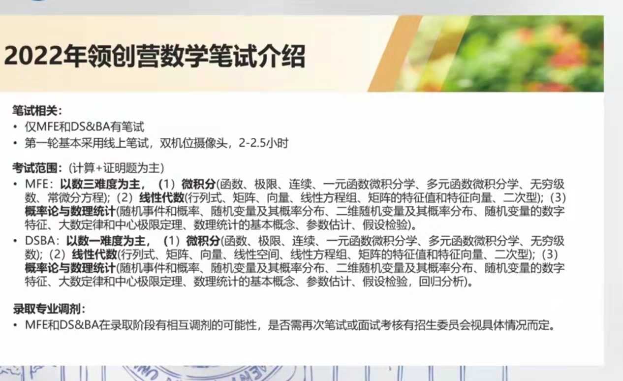 第一批的考试题目为10道大题,每题15分,数分、线代和概率论的比例大约为2:1:2,第一批的笔试难度并不大,但计算量比较大,时间比较紧张。据我所知,管院每一批的笔试考核风格都有所不同,今年第一批大都是计算题,而第三批则有许多证明题。由于我只有1周左右的时间准备笔试,所以准备得很仓促,只看了一些定义以及定理的证明,计算题做得不太熟练,许多题目都没有算出最终结果。
