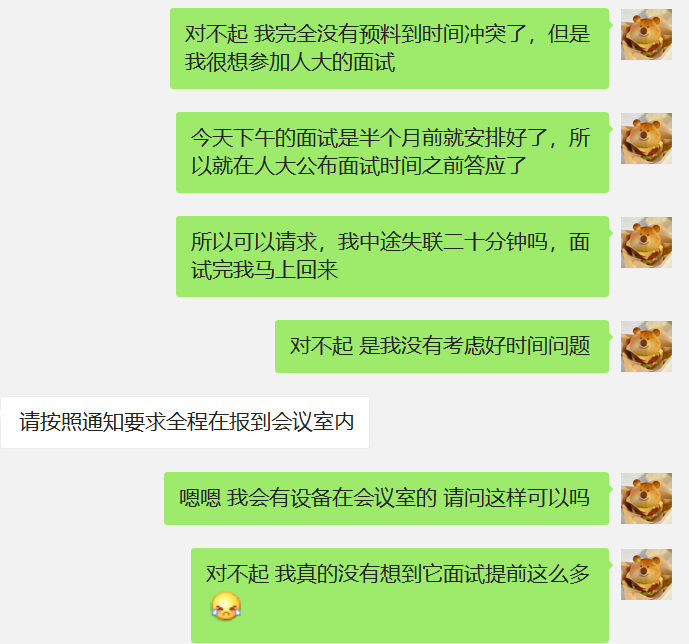 不到两点,人大这边就开始催着我们进入测试机位的会议室,开设双机位视频并开麦,不可以使用第三台设备。我就很着急呀,我就问人大工作人员:“可以请求,我中途失联二十分钟吗,另一边面试完我马上回来”,人大这边很强硬说不行,要全程开摄像头在线。岭南这边也不可能临时为我换顺序了。