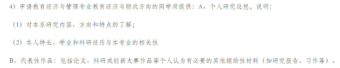 此外申请教育经济与财政方向还需要提供一份个人研究设想和代表性作品,关于对本系内容的了解,我在北大教育学院官网看了教育经济与管理专业的科研人员及其主要研究领域,然后大致总结了一下。关于本人学业和教育专业的关系,我这样写到,对于教育经济学,在教育学界和经济学界都比较认同的观点应该是教育经济学是教育学和经济学交叉的一门学科,因为教育经济学既要使用经济学的理论与方法来研究教育领域的相关问题,又要利用教育理论与方法来研究经济发展的智力开发等问题,经济学和教育学是相互关联,相辅相成的。作为经济学专业的学生,也可以把教育理解为一种资源,我们要用经济学的理论和方法,来研究如何在个人和团体中配置教育资源。