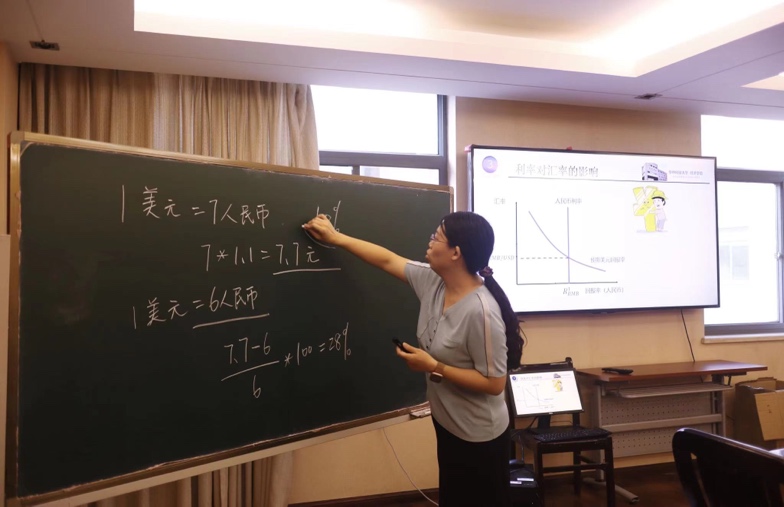 活动伊始,参赛老师张斯琦先简要概括了所授课程的概览、教学目标、授课思路、教学方法和思政元素五大方面内容。然后以自选课程片段为例进行授课展示,讲授《国际金融学》课程中“外汇市场均衡:利率如何影响汇率”。她以典型新闻事件“美国硅谷银行破产”作为背景引入,讲述本节课的教学重点“一国货币高利率如何影响汇率”,并适当凝练出“中国独立自助的货币政策”的思政元素,最后引导学生们对课堂内容进行讨论与总结。