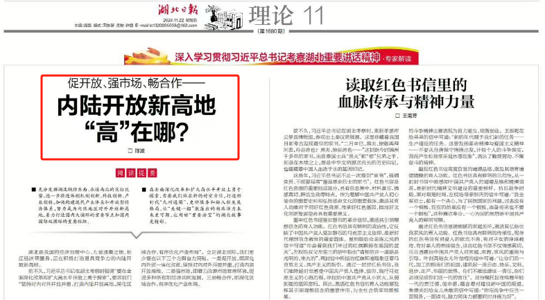 2500年前,神奇瑰丽的楚文化就远播中外;400多年前,“万里茶马古道”就留下了荆楚客商的足迹;近现代以来,湖北更成为中国早期工商业文明的摇篮;新中国成立以后特别是改革开放以来,湖北经济社会取得长足发展,对外开放步伐不断加快。在全面深化改革和扩大高水平开放上勇于探索,需要我们站在新的时空方位,打造新时代“九州通衢”,更好服务和融入新发展格局,让“关键一招”激荡出的湖北活力未来更可期,让用好“重要法宝”的湖北故事更精彩。