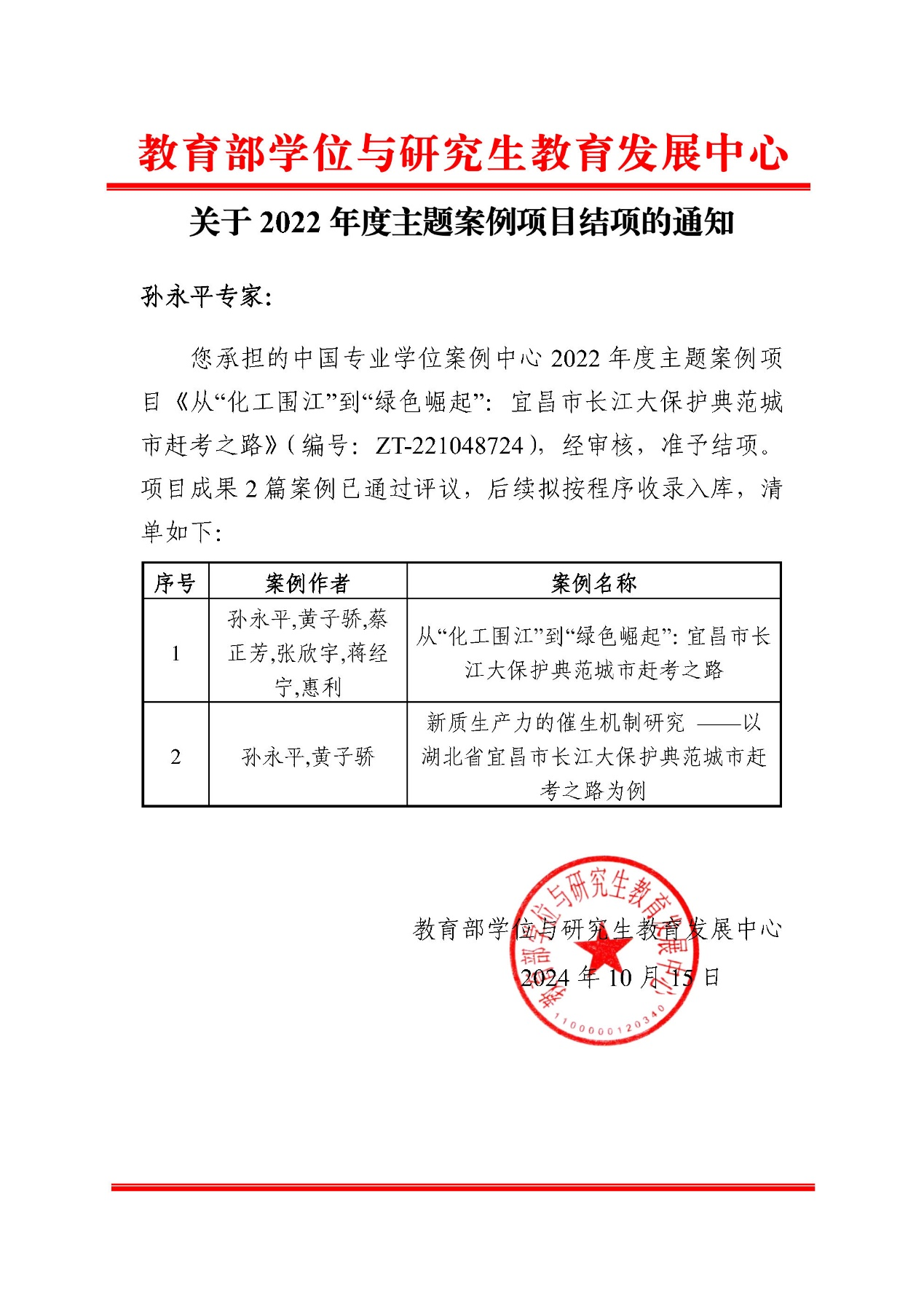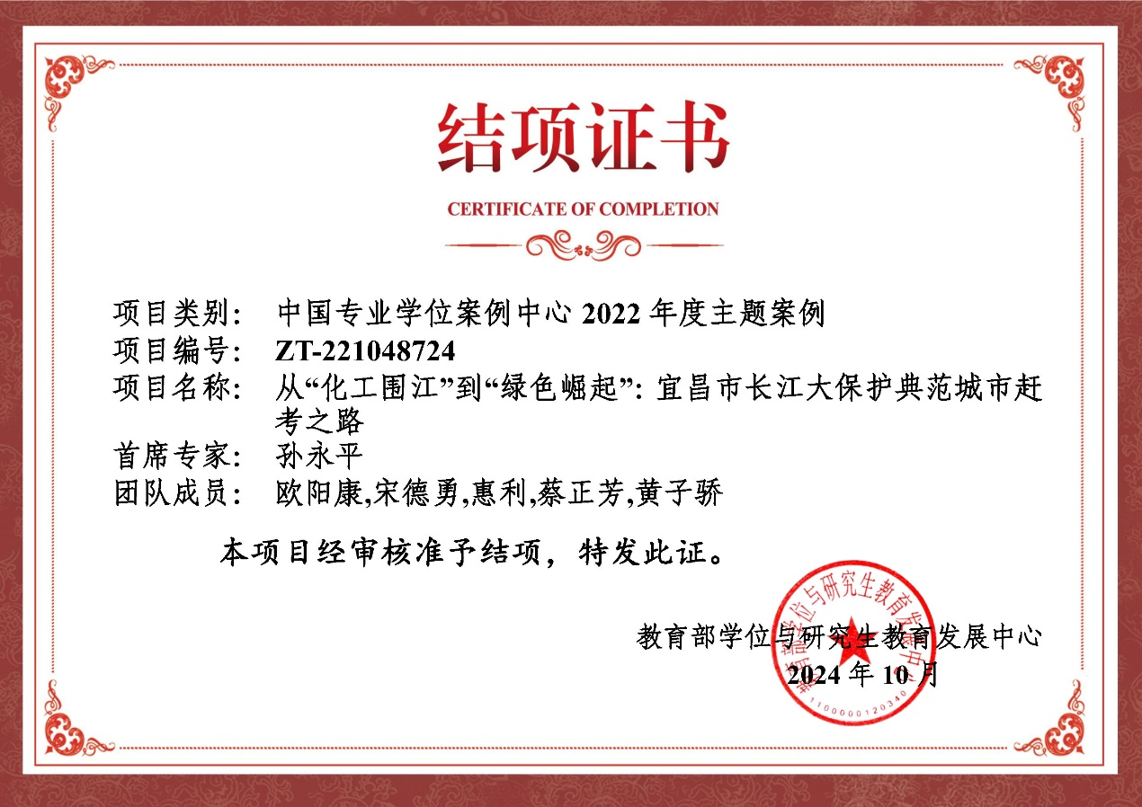 近日,教育部学位与研究生教育发展中心(以下简称“学位中心”)发布了《关于2022年度主题案例项目结项的通知》。经过严格的评审流程,学院孙永平教授作为首席专家主持的主题案例项目《从“化工围江”到“绿色崛起”:宜昌市长江大保护典范城市赶考之路》(编号:ZT-221048724)顺利结项。