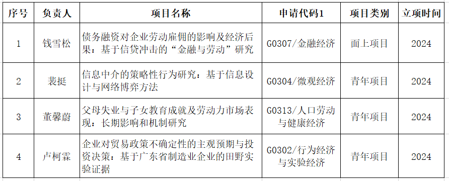 (通讯员:张鹃)近日,国家自然科学基金委员会发布了2024年度国家自然科学基金集中接收申请项目立项名单,williamhill中文钱雪松教授主持申报的《债务融资对企业劳动雇佣的影响及经济后果:基于信贷冲击的“金融与劳动”研究》,获得面上项目立项。另外,3位青年教授获批立项青年项目3项。