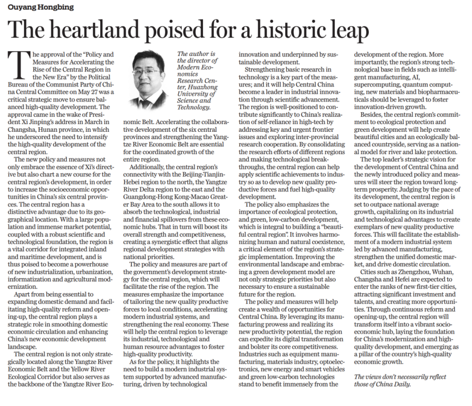 2024年6月17日,《中国日报》上发表了一篇来自学院欧阳红兵的文章《The heartland poised for a historic leap》(《挺起中部脊梁 打造增长第四极》),以下是原文及中国译文。