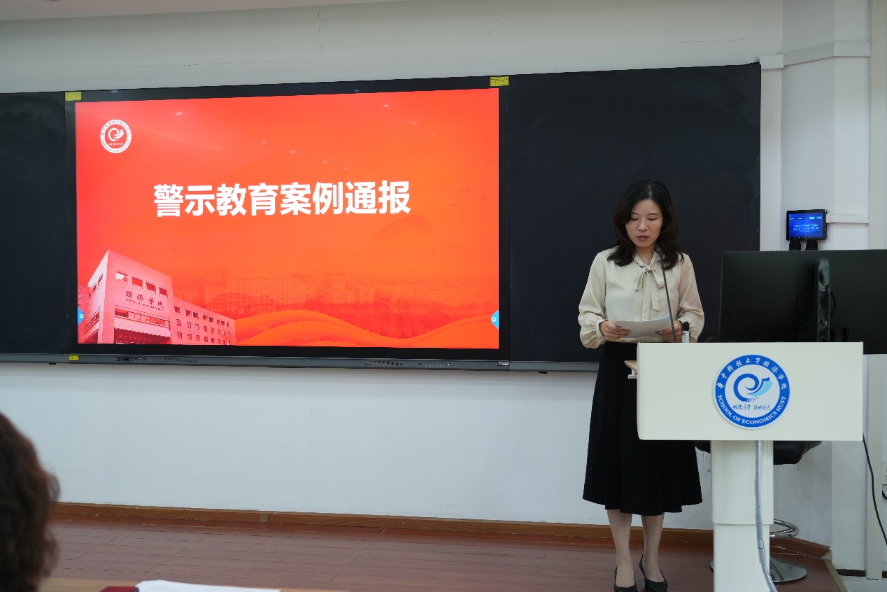 学院党委副书记、纪委书记刘雯雯通报了学校警示教育案例。她号召全体教师以案为鉴,筑牢法纪意识,学院也将持续健全监督机制,通过常态化警示教育与风险排查,推动形成崇廉尚洁的育人环境。