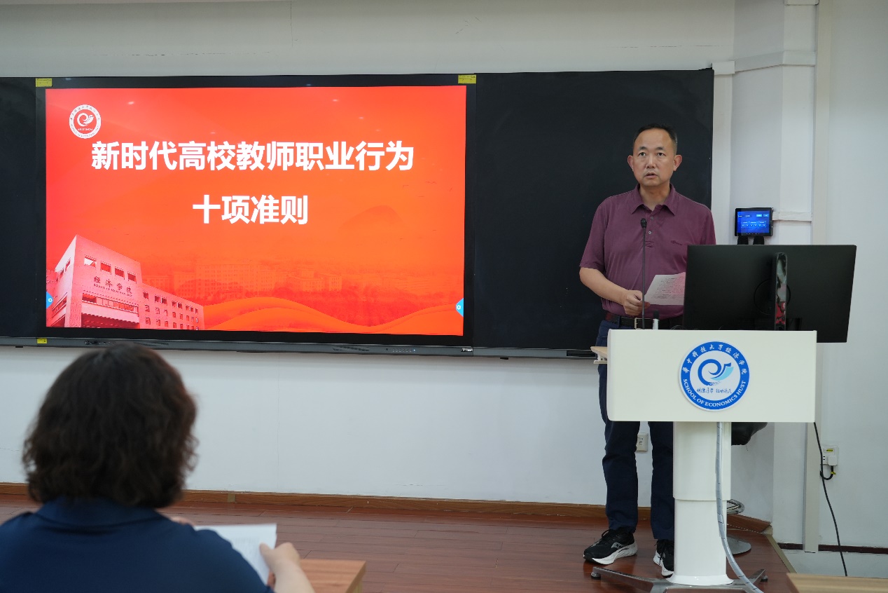 副书记、副院长姚遂带领全体教职工重温《新时代高校教师职业行为十项准则》。他指出,全体教师需牢记“立德树人”根本任务,关爱学生,言传身教,以高尚师德和扎实学识践行育人使命。