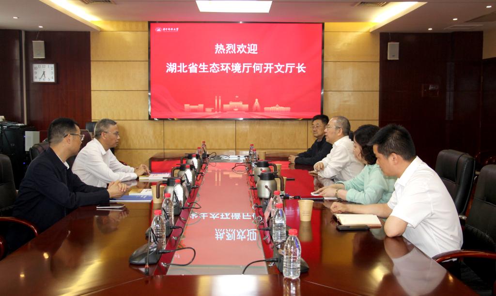 4月28日,湖北省生态环境厅党组书记、厅长何开文来访我院,学院院长张建华、党委书记刘雅然参会,双方就加强政校合作深入交流。