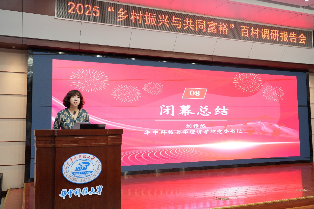活动最后,刘雅然做总结讲话,她指出党中央历来重视“三农”问题,“乡村振兴与共同富裕”百村千户调查,正是学院响应党中央“乡村全面振兴”部署的生动实践。同学们深入田间地头进行调研不仅为学术研究积累了珍贵的第一手资料,更在实践中厚植了“知农爱农”的家国情怀。结合学院的人才培养工作,刘雅然向同学们提出殷切期望:一要夯实基础,厚植乡村全面振兴的理论根基;二要知行合一,锤炼服务 “三农” 的实践本领;三要守正创新,勇担经世济民的时代使命。学院也将持续聚焦 “服务国家战略”的办学导向,交出更具分量的 “华科大答卷”。