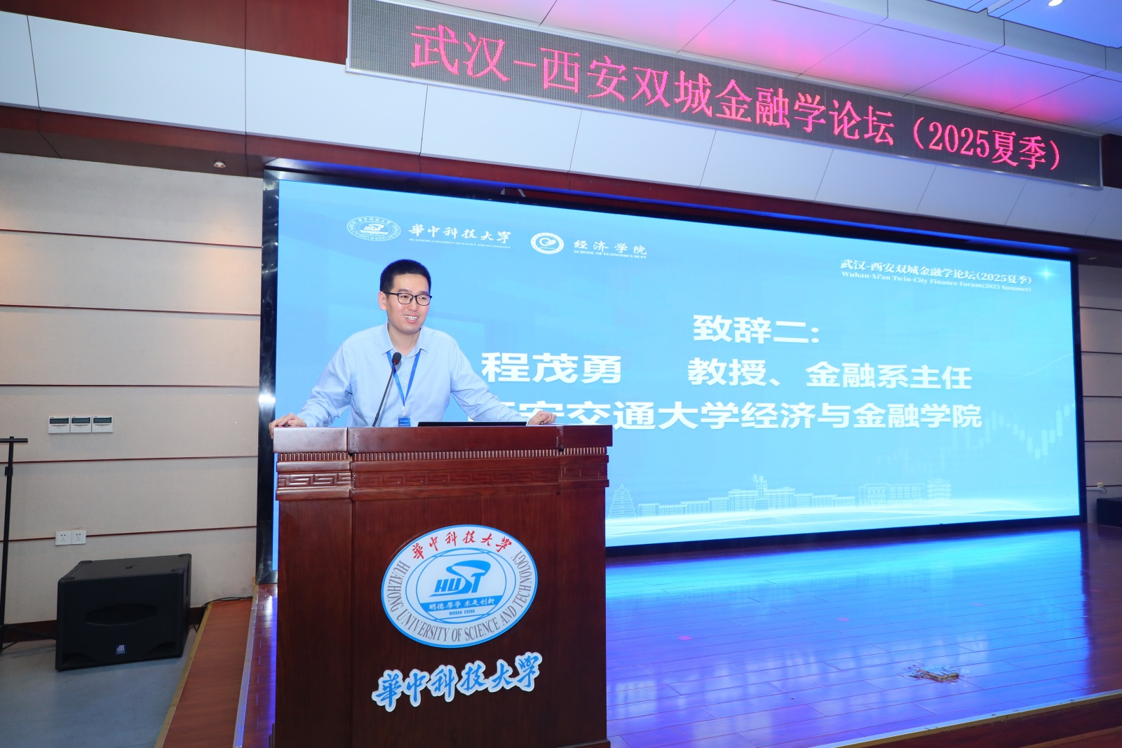西安交通大学经济与金融学院金融系主任程茂勇致辞。他代表上一届主办方,向本届论坛主办方的精心筹办表示感谢。他强调武汉、西安两地的兄弟院校携手共同搭建起双城论坛这一高水平的学术交流平台恰是对国家战略的精准响应,为两地学者搭建起多维度的对话成果,体现了学术研究的时代担当,愿两地高校以双城论坛为纽带,深化合作、携手共进。