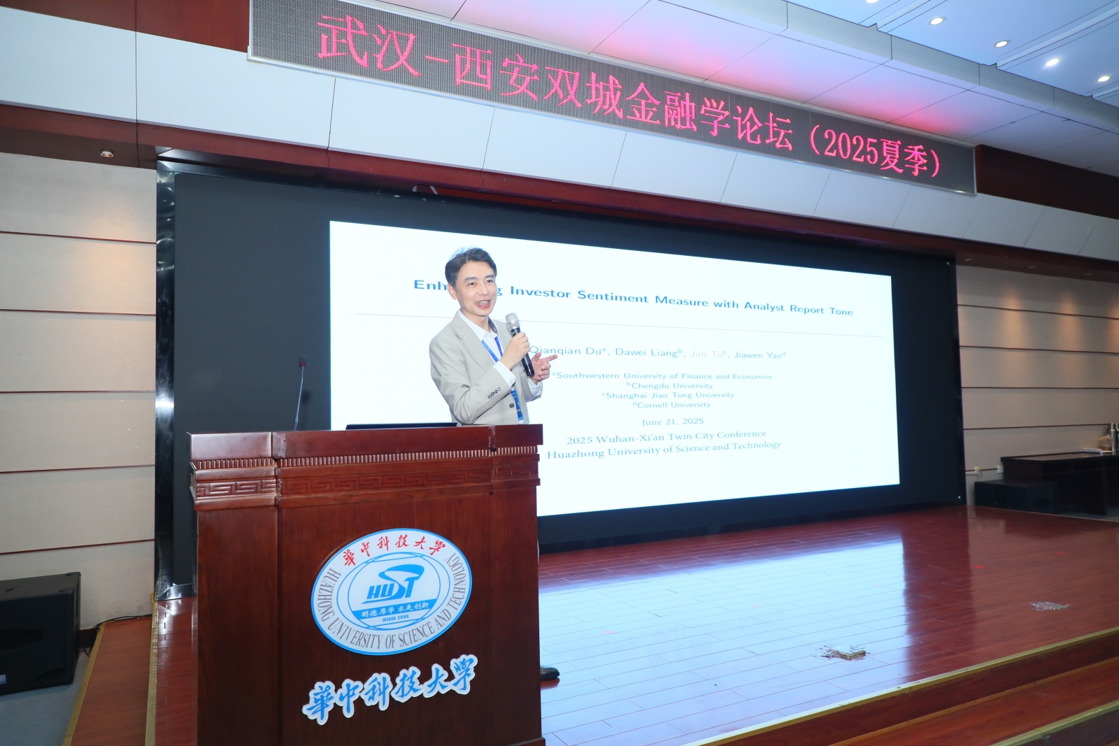 主旨报告环节由孔东民主持,邀请上海交通大学安泰经济与管理学院、上海交通大学中银科技金融学院凃俊进行了题为“Enhancing Investor Sentiment Measure with Analyst Report Tone”的主旨演讲。他主要围绕投资者情绪对股市的影响进行讨论,提出投资者情绪是股价波动和市场分化的核心驱动力,创建了基于分析师报告文本构建情绪指数的方法,强调大数据和机器学习在情绪分析中的作用。此外,他还讨论了传统情绪指标的局限性,并提出结合多模态数据(如文本、视频)改进指数的思路。最后,凃俊强调今后研究可以关注情绪对股价偏离基本面的影响,并分享其团队在金融文本挖掘和情绪量化方面的研究成果。