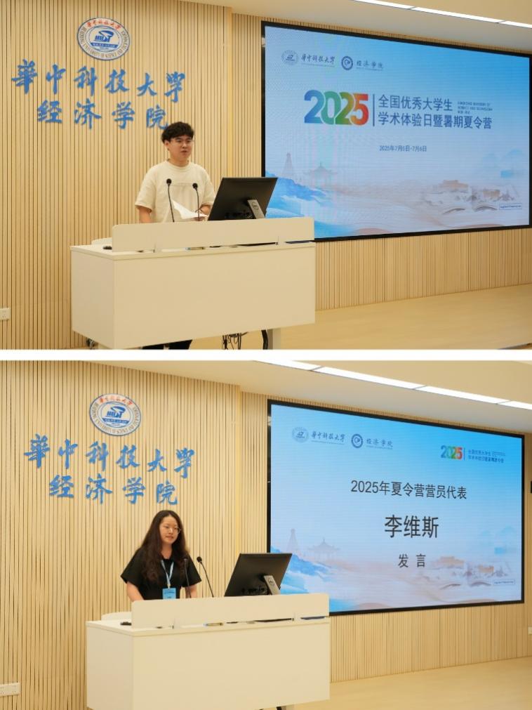 随后,往届优秀营员代表周上钦分享了自己在williamhill中文的学习经历与成长感悟,鼓励学弟学妹们珍惜夏令营机会,深入了解华中大、感受经院氛围。本届营员代表李维斯则表达了对本次夏令营的热切期待,表示将以饱满的热情积极参与各项活动,深入交流、拓展视野,不负这段宝贵的学术旅程。