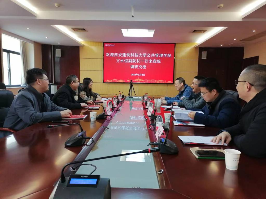 陈斌首先对西安建筑科技大学公共管理学院各位老师的到来表示热烈欢迎,介绍了我院学科发展及学科发展历程。方永恒感谢我院的热情接待,他简要介绍了西安建筑科技大学公共管理学院建院历史、学科特色、学生管理和招生方向,并说明了此次调研的目的,旨在了解我院在数字经济硕士教育教学管理、学科建设、 研究生培养工作等方面做法。
