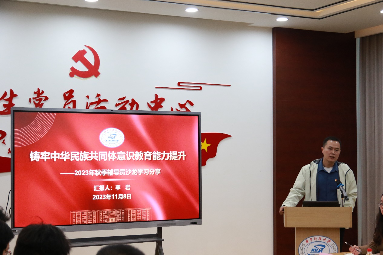 在培训分享环节,法学院辅导员李岩以《筑牢中华民族共同体意识教育能力提升》为主题,分享他在参加第402期全国高校思想政治骨干示范培训班的学习内容。他带领大家重温习近平总书记关于中华民族共同体意识的重要思想,重点梳理学校关于铸牢中华民族共同体意识的重点任务,并结合辅导员“三进三同”的工作要求,提出了对抓牢育人阵地教育实践的思考。