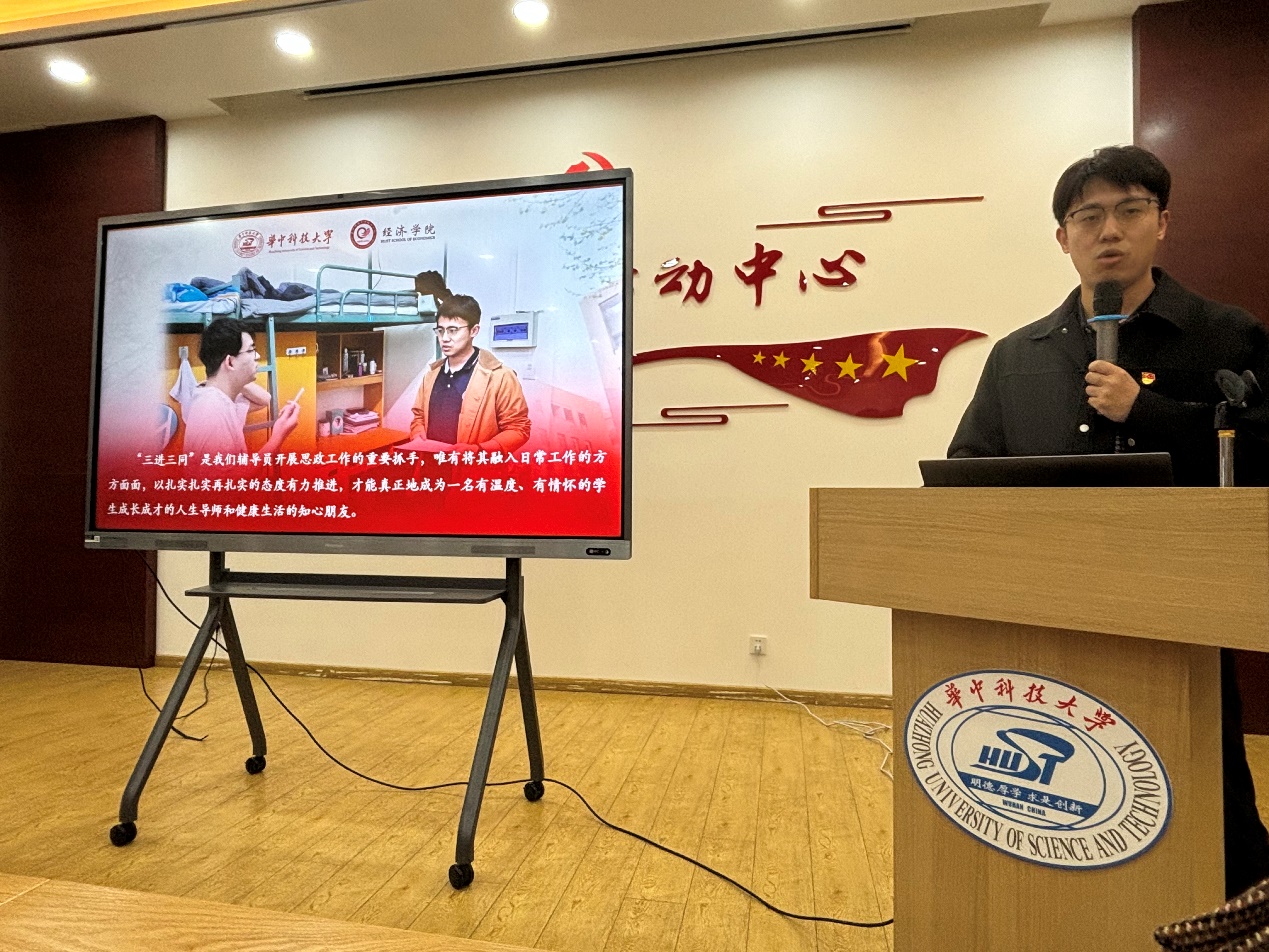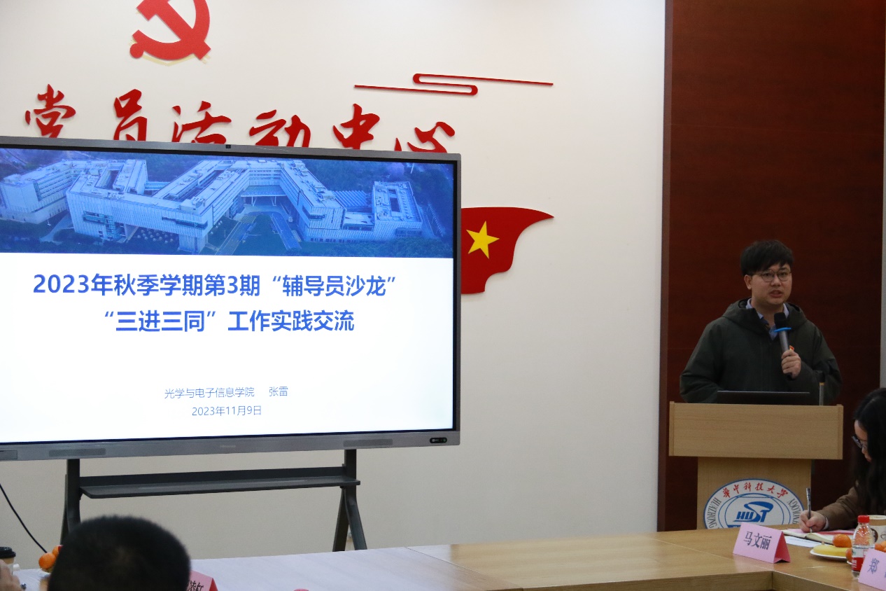 接下来,在“三进三同”实践交流环节,williamhill中文辅导员袁悦与光学与电子信息学院辅导员张雷分别做研究生辅导员和本科生辅导员的“三进三同”经验分享。袁悦以聚焦导学团队、学生需求和能力提升为切入点,强调了研究生辅导员需要抓实培养过程、走进学生内心和增强育人实效,才能成为有温度、有情怀的人生导师和知心朋友。张雷从实施“四个一”工程、培育优良学风、推动“五育并举”和擦亮社区品牌四个方面展开,展示了辅导员落实“三进三同”工作与三全育人要求的具体举措和实践经验。