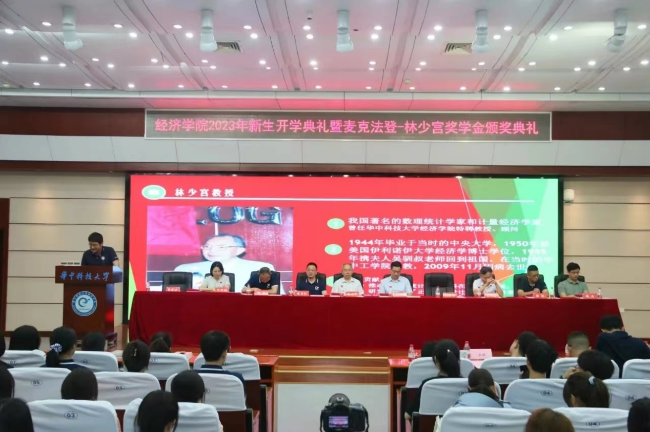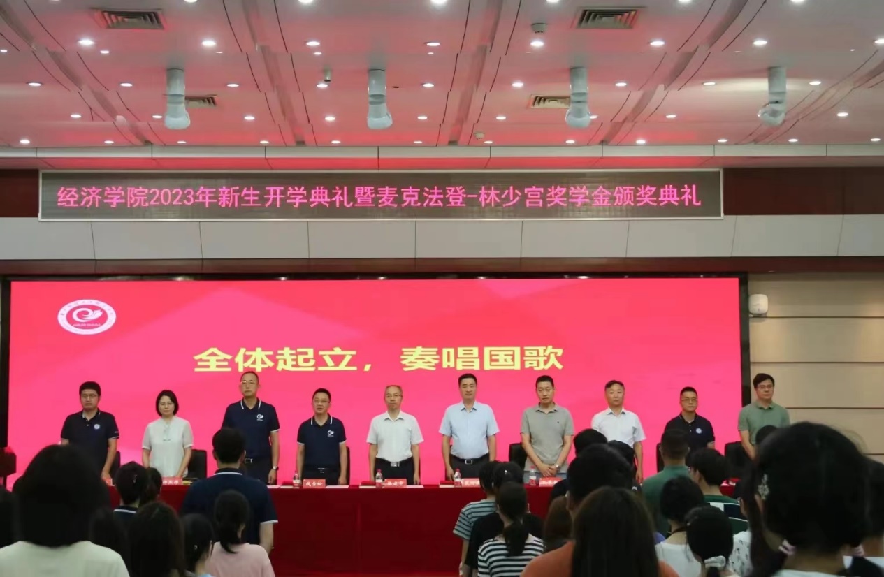 本网讯(通讯员:吴鑫宜 岳铭慧)9月1日下午,学院2023级新生开学典礼暨麦克法登—林少宫奖学金颁奖典礼在学院报告厅举行。学院院长张建华,党委书记戴则健,副院长钱雪松、孔东民,党委副书记、副院长姚遂,经济系主任陈斌,国贸系主任范红忠,金融系副主任魏杰,麦克法登-林少宫奖学金基金会秘书长张学功,本科2023级教师班主任代表钟熙维、沈淑琳、裴挺,全体辅导员老师以及研究生班主任代表出席本次开学典礼。典礼由院党委副书记刘雯雯主持。