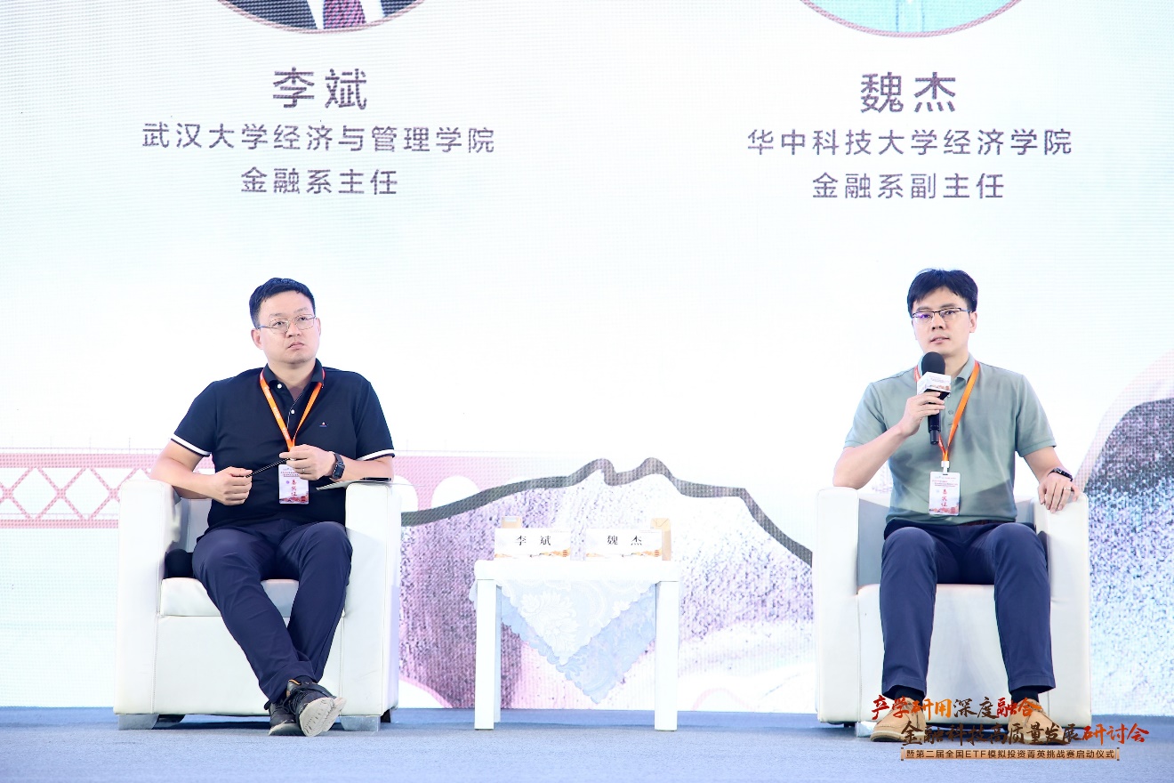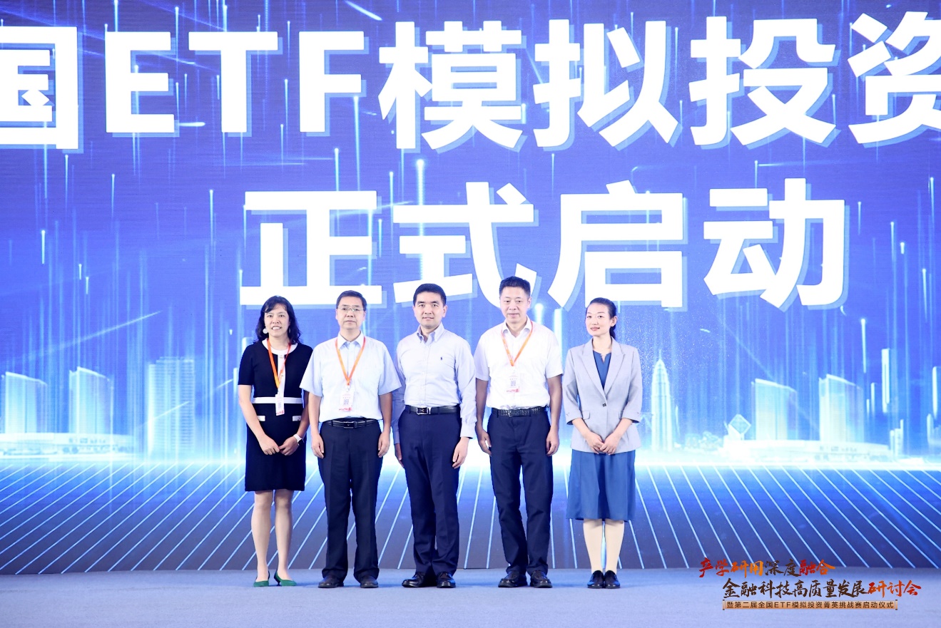 研讨会开幕式后举行了“第二届全国ETF模拟投资精英挑战赛”启动仪式。在深圳证券交易所指导下,东方财富、东财基金联合十一家基金公司共同主办的“第二届全国ETF模拟投资菁英挑战赛”将于九月开启报名。大赛设有知识比拼、模拟投资、投研分析等多元赛道,社会组与高校组分别排名,打造具有广泛影响力和覆盖面的ETF投资者教育服务活动。我院金融系主任左月华与主办方四位代表作为重要受邀嘉宾,参加了本届精英挑战赛的启动仪式。