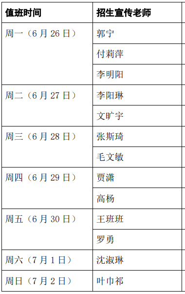 6月26日至7月2日,正值高考志愿填报的黄金咨询时段,学院郭宁、沈淑琳等13位老师组建成了校内院系宣传队伍,以轮班制在光谷体育馆的本科宣传点开展招生工作,保证一周的咨询时段服务全覆盖。