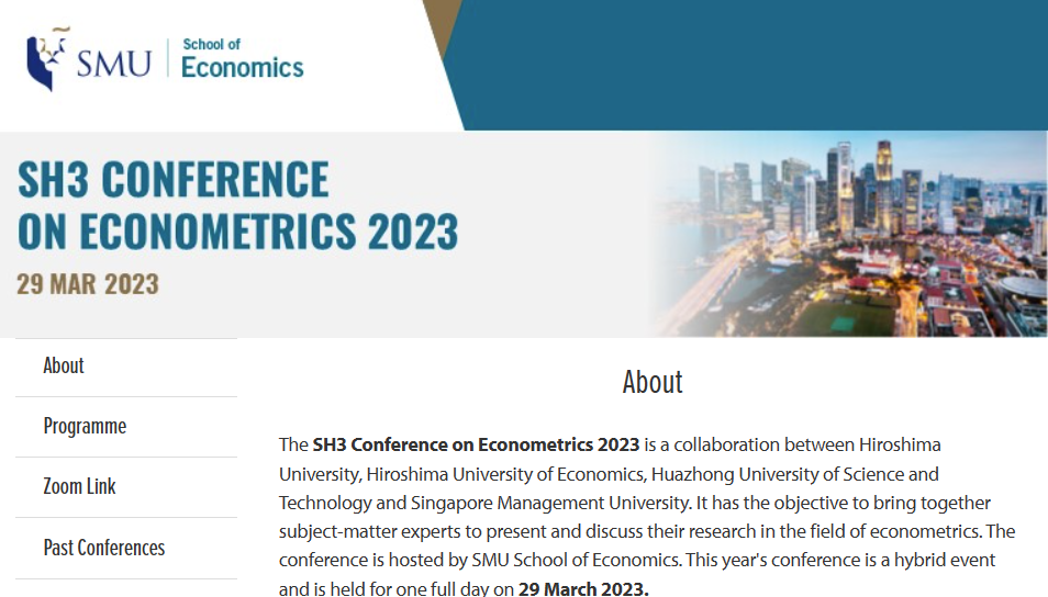 本网讯(通讯员 张鹃 彭译萱)SH3计量经济学会议于2023年3月29日在新加坡管理大学williamhill中文成功举办,该会议是由新加坡管理大学、威廉官网中国和广岛大学联合举办,其目标是汇集专题专家介绍和讨论他们在计量经济学领域的研究。威廉官网中国彭斌副教授、赵钊副教授、2021级研究生彭译萱,新加坡管理大学于俊教授、李嘉教授、张意翀副教授,日本广岛大学的Hiroshi Yamada教授、Ryutah Kato副教授等二十余位人员参加此次会议。