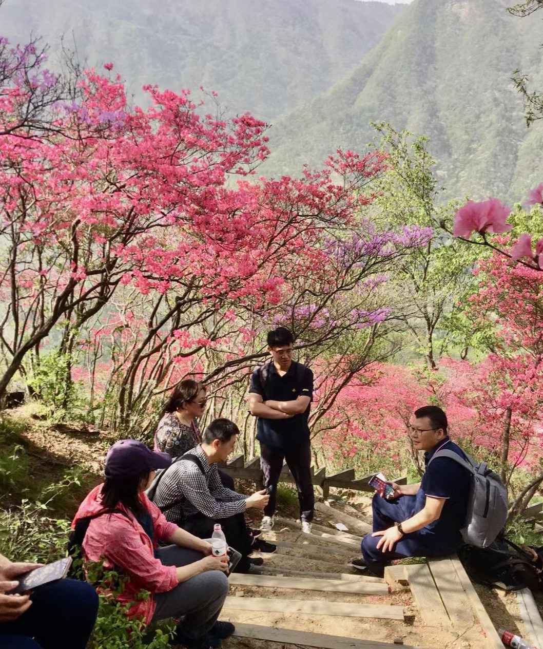 四月是天马寨最美丽的季节,五彩杜鹃沿着最高海拔接近1100米的高度梯次盛开。在漫长的爬山旅途中,老师们行进速度不一,自发形成好几组,老师们有说有笑,一边欣赏沿途美景,一边相互合影留恋,在阳光灿烂的天马寨留下了经院教职工的美丽身影。