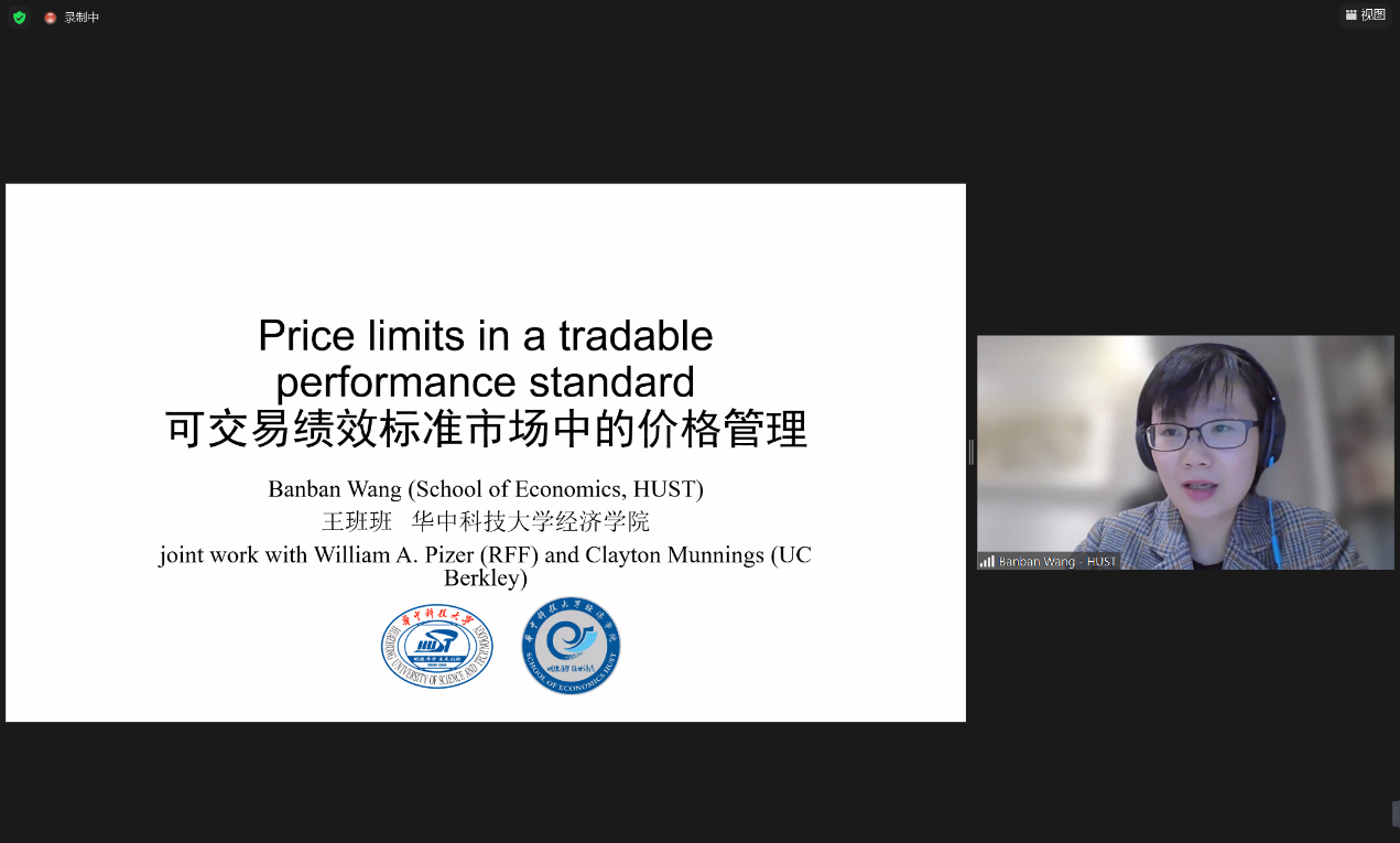 williamhill中文副教授王班班的演讲题目为《可交易绩效标准中的价格管理》。王班班首先介绍了什么是可交易绩效标准及其价格管理。在碳交易市场传统的“总量-交易”机制下,理论和实践均表明引入地板价、天花板价、配额储备等价格限制至关重要。根据Weitzman经典量价之争问题模型,王班班提出了一个简洁的分析模型来推导可交易绩效标准市场中引入混合机制的福利效应。模型模拟表明,如果在中国全国碳市场和加州低碳燃油标准市场中引入价格限制会带来显著收益:当价格较低时可以带来50%以上的福利改进。最后王班班以委托拍卖为例讨论了上述机制的实施。