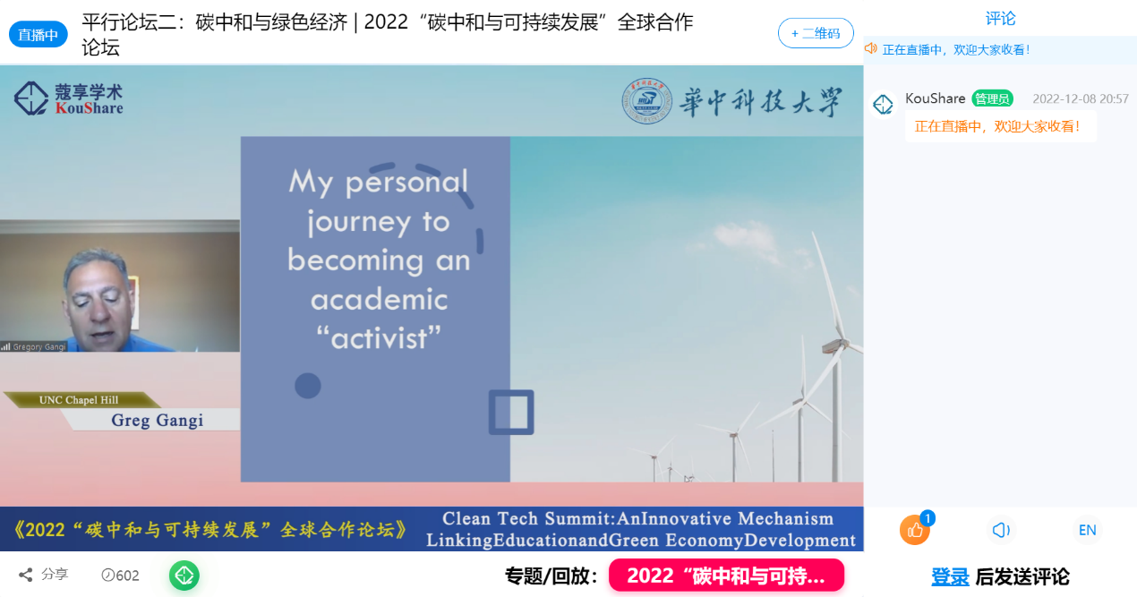 北卡罗来纳大学教堂山分校教授、清洁技术与创新项目副主任Greg Gangi的演讲题目为《清洁技术峰会:连接教育与绿色经济发展的创新机制》。Gangi教授首先介绍了创办清洁技术峰会的初衷:美国在许多领域缺少强大的创新生态;清洁技术发展缓慢且投资者缺乏耐心;相关专业的学生难以找到适合的工作。Gangi教授强调要整合学校各方面的力量,从影响学校层面决策、联系利益相关方与政治领导人、建立私营部门协同作用、培养学生就业能力等几个方面入手,并在未来推动整个北卡罗莱纳三角研究园(Research Triangle Park,RTP)的创新发展。