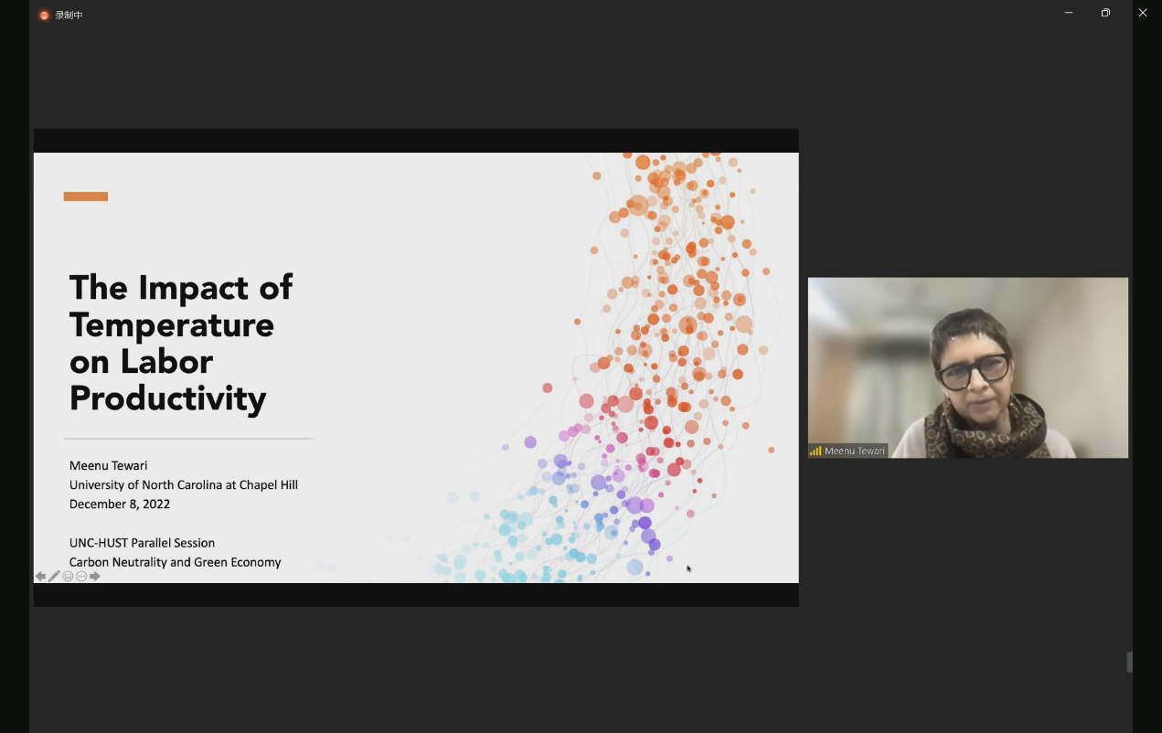 北卡罗来纳大学教堂山分校教授Meenu Tewari的演讲题目为《气温上升对工业生产率和缺勤率的影响》。Tewari教授由参观某印度企业时的见闻引起思考,关注高温天气对于工人生产率的影响。相较于一些极端气候事件,气温的缓慢上升带来的后果可能被低估了。利用印度工厂级别的高频微观数据,研究证实高温天气会使工人的生产力下降且缺勤率增加,从而影响经济产出。每摄氏度升温导致工厂年产量下降约2 %。气候控制可以显著减轻生产力损失,但无法提高出勤率,且代价可能很高。仅凭市场和企业层面的调控,不足以应对高温带来的影响,还将产生不公平的负担。