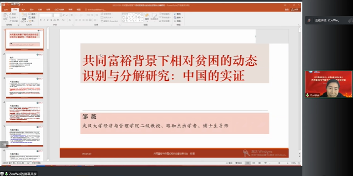 第三位演讲嘉宾为武汉大学经济与管理学院二级教授、珞珈杰出学者邹薇,她的发言主题是《共同富裕背景下相对贫困的动态识别与分解研究:中国的实证》。该研究基于绝对贫困线与相对贫困线制定标准差异大,相对贫困无法直接进行跨国比较,以及绝对贫困能够被公共政策消除而相对贫困会长期存在等背景,探讨了如何基于中国国情确定相对贫困线标准,并对绝对贫困和相对贫困进行量化分解,最终揭示脱贫攻坚政策在减贫上的具体成效和实现机制等问题。