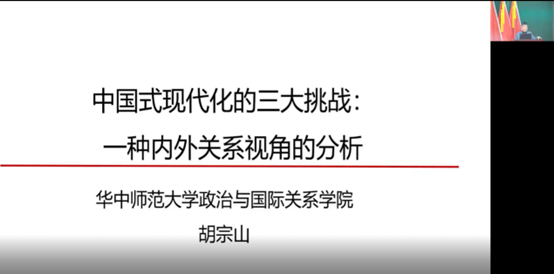 第一位演讲嘉宾为华中师范大学政治与国际关系学院院长胡宗山,他发表的演讲题目为《中国式现代化的三大挑战:一种内外关系视角的分析》。胡院长首先对十九大和二十大两次党代会报告对国际形势判断进行了对比。他提到十九大报告中指出当国内外形势正在发生深刻复杂变化,我国发展仍处于重要的战略机遇期,前景十分光明,挑战也十分严峻,世界正处于大发展大变革大调整时期,和平与发展仍然是时代主题。而在二十大报告中则指出世界之变、时代之变、历史之变正以前所未有的方式展开,一方面,和平、发展、合作、共赢的历史潮流不可阻挡,人心所向、大势所趋决定了人类前途终归光明;另一方面,恃强凌弱、巧取豪夺、零和博弈等霸权、霸道、霸凌等行径危害深重,而和平赤字、发展赤字、安全赤字、治理赤字加重,使得人类社会面临前所未有的挑战。他提到,二十大报告中这些表述的变化可以说明当前的国际形势非常严峻,可以看出党和国家对安全问题的重视程度在不断加强。