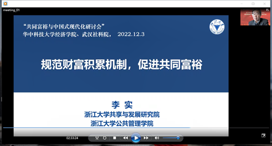 第二位演讲嘉宾为浙江大学共享与发展研究院院长,北京师范大学中国收入分配研究院院长李实,他发表的演讲题目为《规范财富积累机制,促进共同富裕》。李实院长主要从财产积累和财产分配两个板块入手,分别从共同富裕的基本内涵、我国居民财产积累的主要特点、规范财富积累机制等三个方面进行演讲。